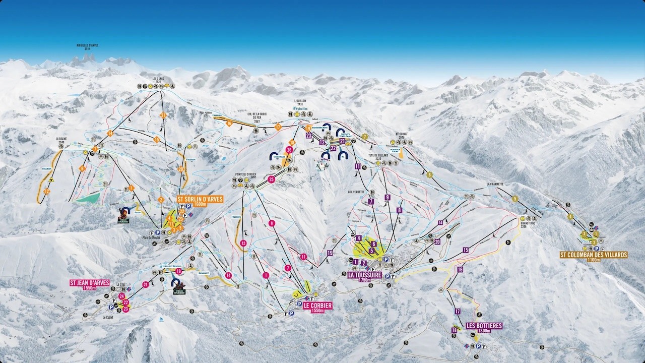 Les Sybelles bestaat uit zes dorpen: La Toussuire, Le Corbier, Saint-Sorlin-d’Arves, Saint-Jean-d’Arves, Les Bottières en Saint-Colomban-des-Villards.