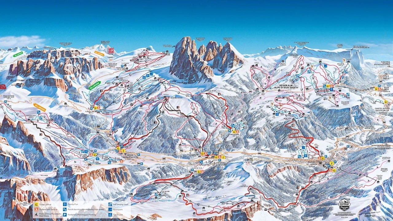 Het gebied beschikt over ongeveer 181 km pistes en 79 liften, samen met Alpe di Siusi onderdeel van Dolomiti Superski.