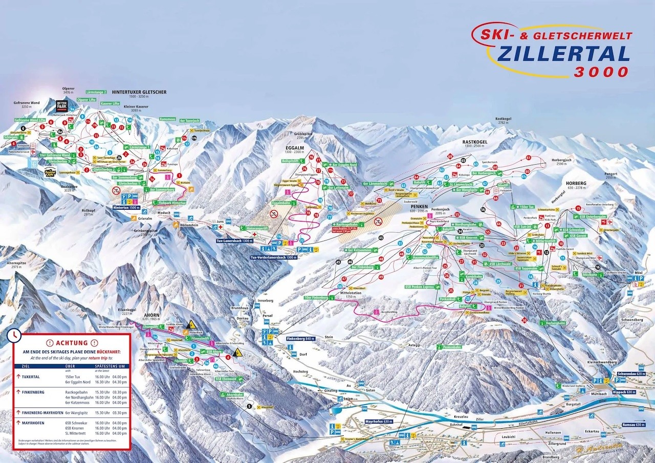 Mayrhofen (Penken/Ahorn), Finkenberg, Tux/Lanersbach (Eggalm, Rastkogel) en Hintertux (gletsjer). Elk dorp heeft skibusverbindingen en snelle toegang tot de liften.